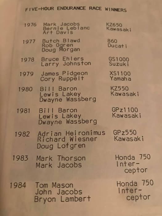 The 5-hour endurance race was won by Bill Baron, Lewis Lakey, and Dwayne Wassberg on a Kawasaki KZ 550, completing 118 laps. Out of 51 teams that started, more than 30 finished.