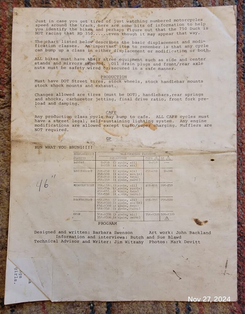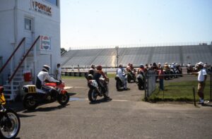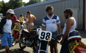 Race 2 in August saw a major challenge when Bill Bune spilled a tank of oil from turn 3 to turn 5, leaving only 10 of 27 bikes finishing. Thankfully, no serious injuries occurred. New safety regulations required Snell 75 approved helmets this year. Chris Christensen claimed the #1 plate, followed by Mark Jacobs (#2) and Mark Miles (#3). History was made with the first all-female endurance team featuring Julia Vanatta, Lynn Krotzer, and Joanne Gregg. The 5-hour endurance race was won by James Pidgeon and Cory Ruppelt on a Yamaha XS 1000, completing 143 laps.