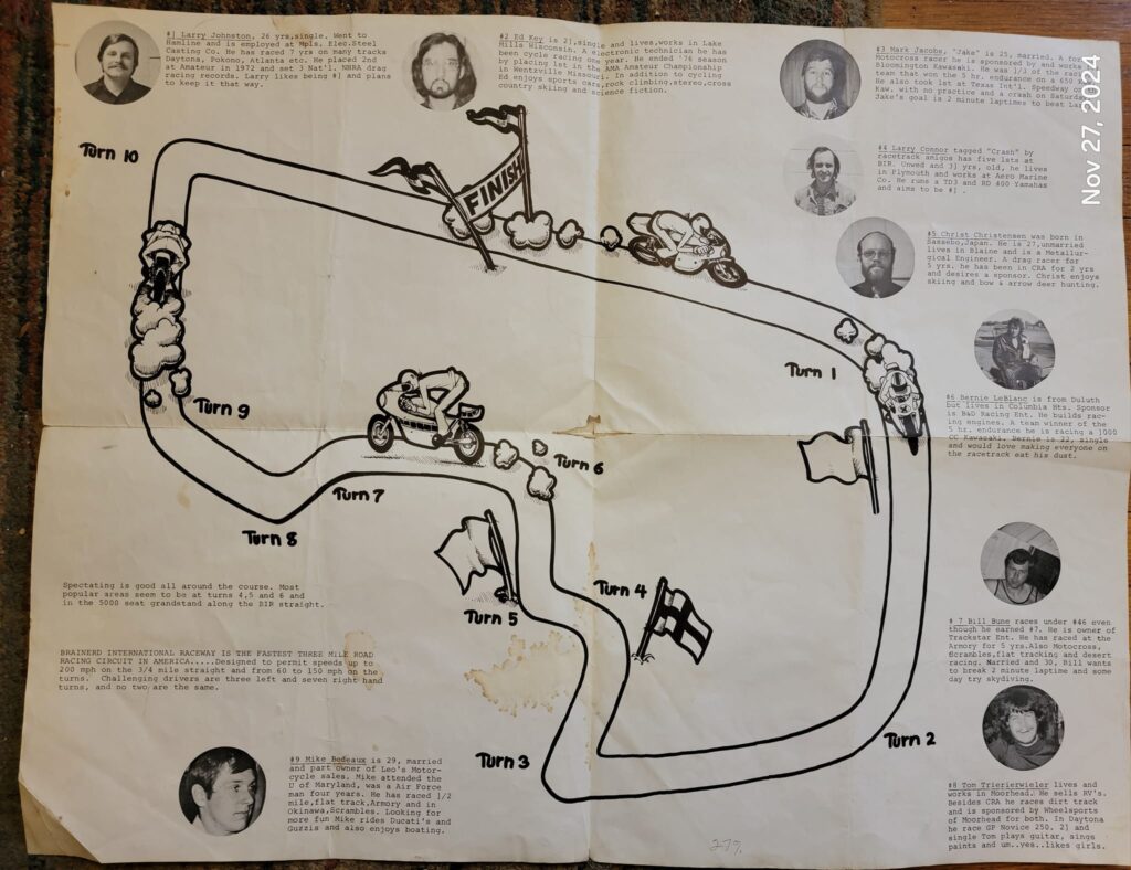 A typical CRA race weekend at BIR featured Friday evening camping and registration, Saturday registration, practice, and evening festivities, followed by Sunday afternoon races. The May weekend saw a dramatic incident when Larry Connor crashed in turn 9, hitting the guardrail. Fortunately, he's recovering well, but his TZ750 won't be ready for June. Racers aimed to break the 150 mph barrier and achieve 1:55 lap times—before the turn 9 ‘bus stop’ existed. Mitch Klempf (#710) averaged a 2:02.1 lap time, translating to an 89 mph average speed, with an estimated straightaway speed of 130-135 mph. Larry Johnston secured the #1 plate, with Mitch Klempf taking #2 and Chris Christensen #3. The 5-hour endurance race was won by Bruce Ehlers and Larry Johnston on a Suzuki GS 1000, completing 137 laps out of 41 entries, with 22 bikes finishing.