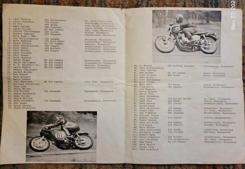 This year’s schedule featured five race weekends, with a new points system replacing last year’s trophy-only format (1st = 3 pts, 2nd = 2 pts, 3rd = 1 pt). Larry Johnston claimed the overall championship with 40 points, followed by Ed Key with 20. The CRA had 600 members as of October 7, with racer licenses priced at $15 for the year. The inaugural 5-hour endurance race, benefiting the Kidney Foundation’s 'Race for Life,' saw participants raising pledges per lap completed. Mark Jacobs, Bernie LeBlanc, and Art Davies took the win on a Kawasaki KZ 650, completing 123 laps. Remarkably, the winning bike was uncrated just the night before the event at Carl Eide’s shop, ridden to BIR, raced, and then ridden back to the Twin Cities.
